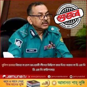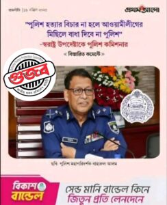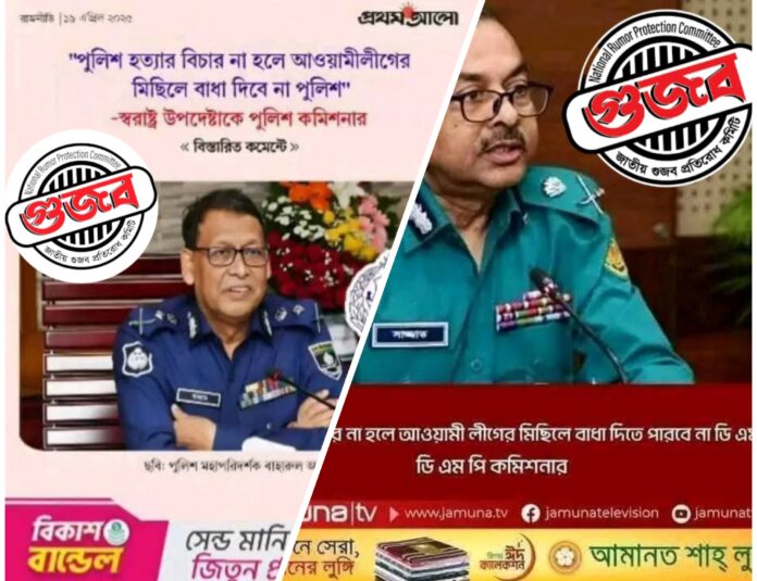 ‘পুলিশ হত্যার বিচার না করলে আওয়ামী লীগের মিছিলে বাধা দিবেনা পুলিশ’ শীর্ষক প্রথম আলো ও যমুনা টিভির দুটি ফটোকার্ড সামাজিক যোগাযোগ মাধ্যমে ভাইরাল হয়েছে যা সম্পূর্ণ গুজব।