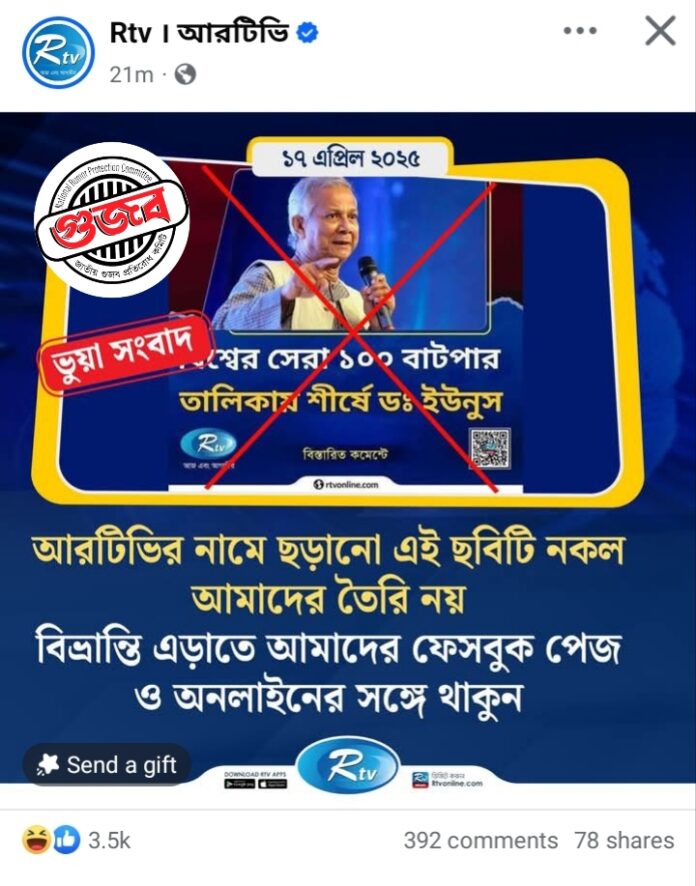 বিশ্বের সেরা ১০০ বাটপারের তালিকায় শীর্ষে ড. মুহাম্মদ ইউনূস সম্বলিত ফটোকার্ডটি আরটিভি’র নয় বলে গণমাধ্যমটি তাদের অফিসিয়াল ফেসবুক পেজে নিশ্চিত করেছে।