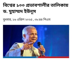 বিশ্বের ১০০ প্রভাবশালী ব্যক্তির তালিকা প্রকাশ করেছে যুক্তরাষ্ট্রের প্রভাবশালী সংবাদ সাময়িকী টাইম ম্যাগাজিন। ২০২৫ সালের জন্য এ তালিকায় স্থান পেয়েছেন বাংলাদেশের অন্তর্বর্তী সরকারের প্রধান উপদেষ্টা ড. মুহাম্মদ ইউনূস। তার নাম রয়েছে ‘নেতা’ ক্যাটাগরিতে।